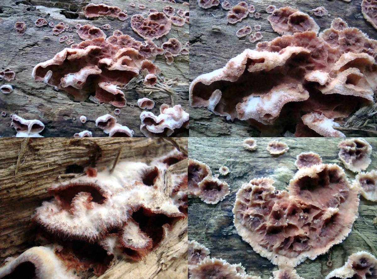 | 자실체 | 자실체는 반배착생, 선반모양∼반원형의 갓을 길게 형성한다. 갓은 2∼8×1∼3cm, 두께 2∼3mm 정도이다. 갓의 표면은 흰색∼분홍색을 띤 황백색. 연한 털이 덮여 있다. 하면 자실층은 불규칙한 주름이 종횡으로 심하게 잡혀 있어서 얕은 각형(角形)의 주름구멍을 형성한다. 생육 중에는 담황∼오렌지분홍색. 오래되면 오렌지 갈색을 띤다. 말랑말랑하고 유연하며 건조할 때는 연골질이 된다. 재목에 백색부후를 일으킨다. |
