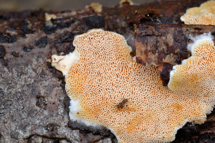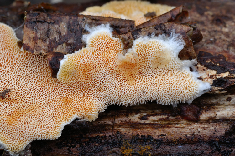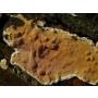 | 자실체 | 자실체는 배착생이나 얇게 반전(反曲)되기도 한다. 신선할 때는 질기며 기질에서 분리될 수 있으나 건조할 때는 깨진다. 두께 2mm 정도. 구멍은 각형 또는 불규칙한 형이고 찢어진 모양의 격막이 있고 6개/mm 정도. 흰색을 띤 가죽 색 또는 분홍색을 띤 가죽 색. 살은 얇고 흰색이며 섬유상. 가장자리는 면모가 있고 허연색이다가 크림색이 된다. |