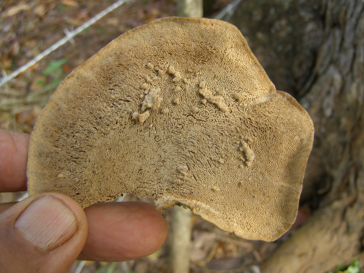 하면 자실층: 관공상, 구멍은 칙칙한 갈색~녹슨 갈색, 재회색 끼가 있다. 구멍은 둥글고, 1~3개/mm, 관공은 같은 색, 길이 7mm 정도,