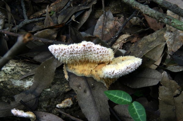 | 자실체 | 갓은 대가 없고 기물에 직접 부착된다. 반원형이면서 편평하거나 낮은 둥근산형이 된다. 폭 4∼8cm, 두께 1∼2.5cm, 표면은 흰색, 황백색 또는 연한 재목색, 미모가 덮여 있거나 또는 거친 털이 덮여있다. 드물게 불선명한 테 무늬가 있다. 가장자리는 얇고 다소 둔하다. 살은 비교적 얇고 두께 2∼5mm, 백색∼황백색. 코르크질∼가죽질이다. 관공은 허연색∼크림색이다가 담황토색이 된다. 구멍은 폭이 넓고 미로상이거나 다소 주름살 모양 또는 관공상이며 관공벽이 매우 두껍다. 대는 없다 |