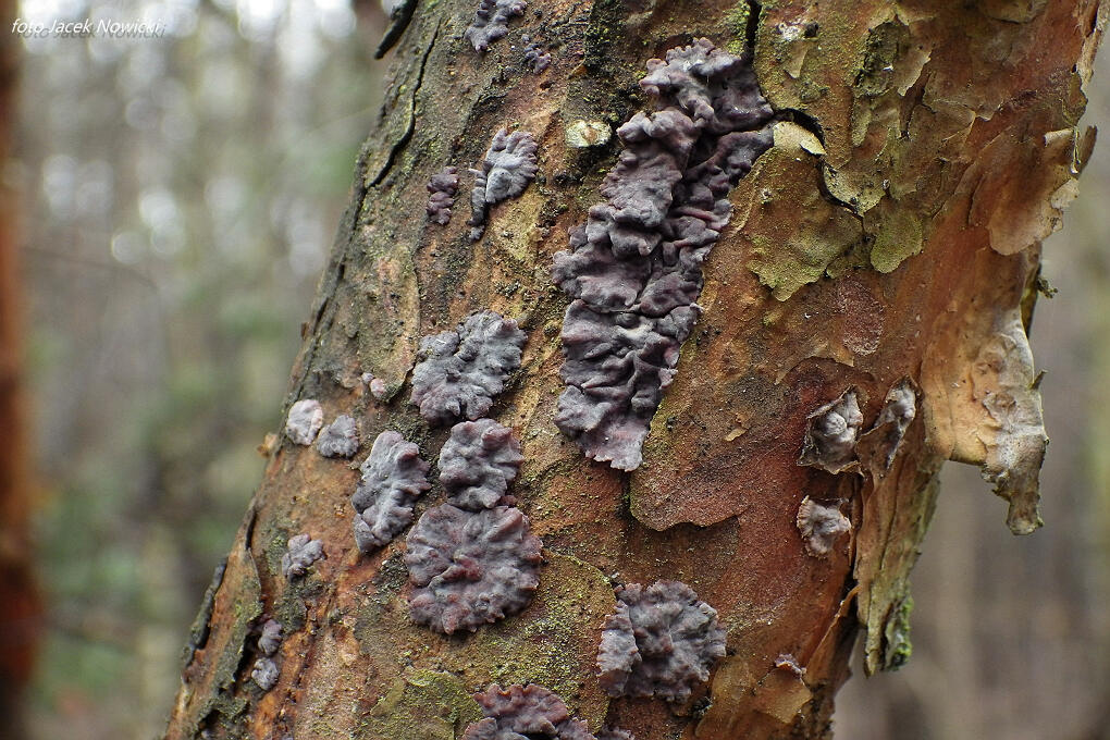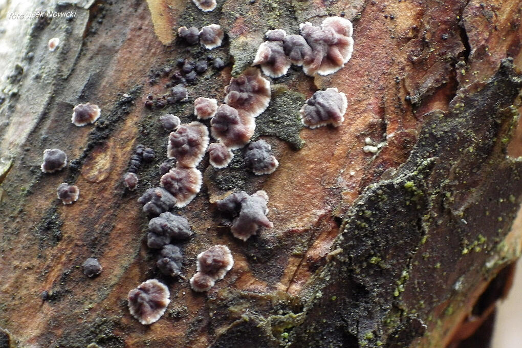 | 자실체 | 자실체는 전체가 배착생. 자실층은 처음에 직경 1∼5cm 정도 크기, 두께 0.5mm 정도의 둥근 모양으로 주로 죽은 소나무류 가지에 발생하며 때때로 이 자실층 들이 융합해서 수 cm 크기의 막편을 만든다. 표면은 주름이 잡혀 있고 작은 결절들이 있으며, 때로는 약간 분상이다. 자적색∼회적색이고 중앙은 다소 회색을 띠기도 한다. 가장자리는 기물에 붙어 있거나 약간 들어 올려져 있고, 허연색∼연한 적색을 띠며 경계가 분명하다. 신선할 때는 유연하고 건조할 때는 부서지기 쉽다. |