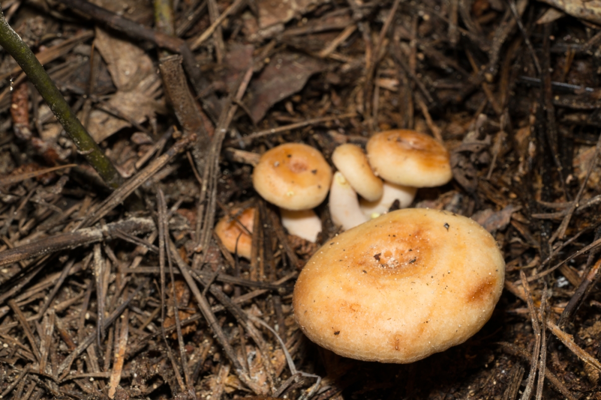 | 자실체 | 갓은 3∼9cm의 소형∼중형. 중앙이 오목한 둥근산형이다가 약간 깔때기 형이 된다. 표면은 허연색, 담황색을 띤 계피색 또는 갈색을 띤 연한 살색인데 테무늬가 있거나 또는 없다. 습할 때는 다소 점성이 있지만, 건조되기 쉽다. 살은 거의 흰색. 절단하면 황색으로 변한다. 유액은 흰색, 공기에 접촉하면 신속히 황색이 된다. 다소 중독성이 있어서 식용하지 않는다. 주름살은 크림색이다가 연한 살색이 되며, 오래되면 적갈색을 띤다. 폭은 보통이고 촘촘하며 대에 내리붙음. 대는 3∼8cm(굵기10∼20(25)mm), 갓보다 연한 색, 후에 진해진다. 속이 비어 있다. |