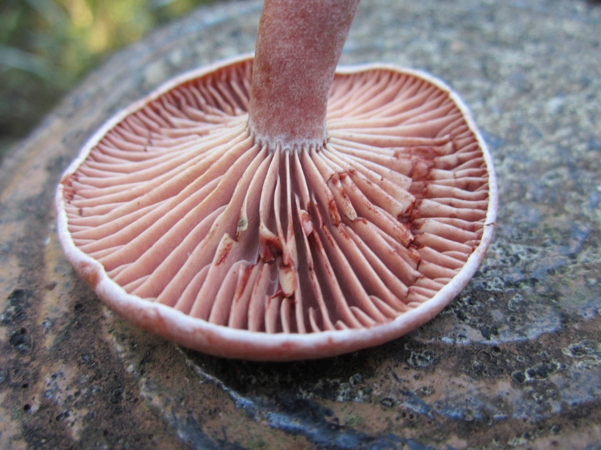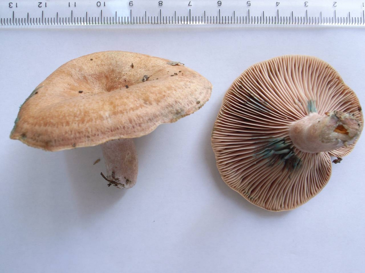| 자실체 | 갓은 5∼10cm의 중형, 중간이 오목한 둥근산형이다가 거의 평평하게 퍼지며 약간 깔때기 형이 된다. 중심에는 조그만 꼭지가 생기기도 한다. 표면은 습할 때 다소 점성이 있다. 연한 적갈색 또는 붉은 색을 띤 탁한 갈색. 약간 진한색의 테 무늬가 있고 오래되면 불명료해 진다. 평활, 상처받은 부분은 청록색의 반점이 생긴다. 처음에 가장자리는 안쪽으로 감기고 백분상이다. 식용하나 맛은 그다지 좋지 않다. 주름살은 갓과 비슷한 색. 상처를 받은 부분은 처음에 암홍갈색이나 청록색으로 변한다. 폭이 보통이고 촘촘하며 약간 대에 내리붙음. 대는 2∼5cm(굵기10 20m), 갓과 거의 같은 색. 상하 같은 굵기이거나 밑동이 가늘다. 표면은 평활 또는 약간 분상, 속이 차 있거나 비기도 한다. 간혹 청록색의 얼룩이 있다. 살은 허연색이나 대의 표면 부근이나 주름살 윗부분은 적갈색을 띤다. 단단하고 유액은 암홍갈색. 청록색이 된다. |