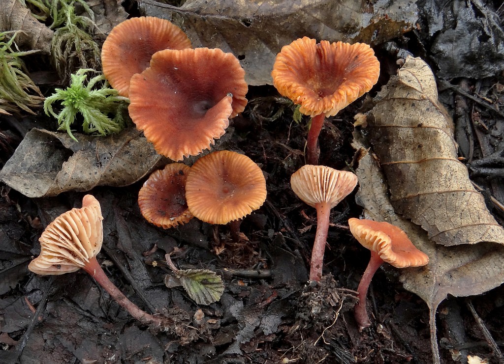 특징 : 극소형. 갓은 오렌지적색∼오렌지황토색, 가장자리는 흔히 반투명 줄무늬가 거의 절반까지 뻗어 있다. 갓 중앙에 작은 점모양 돌출된다. 애기낙엽젖버섯 유사하나 줄무늬가 길고, 올리브색끼를 띠지 않는다.
