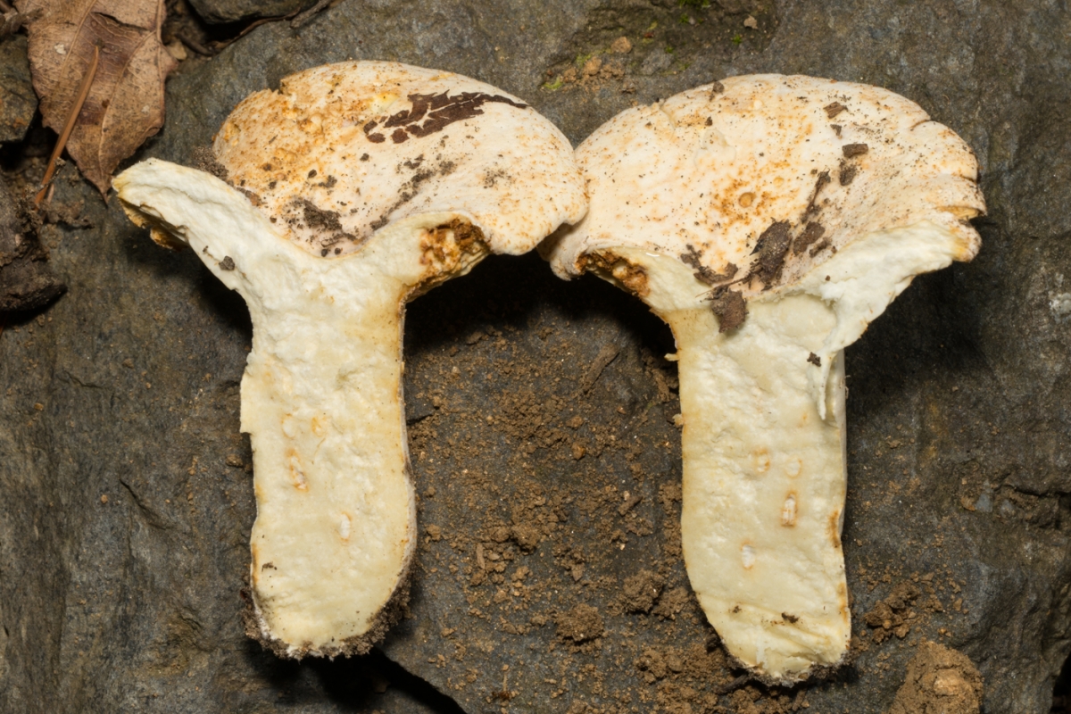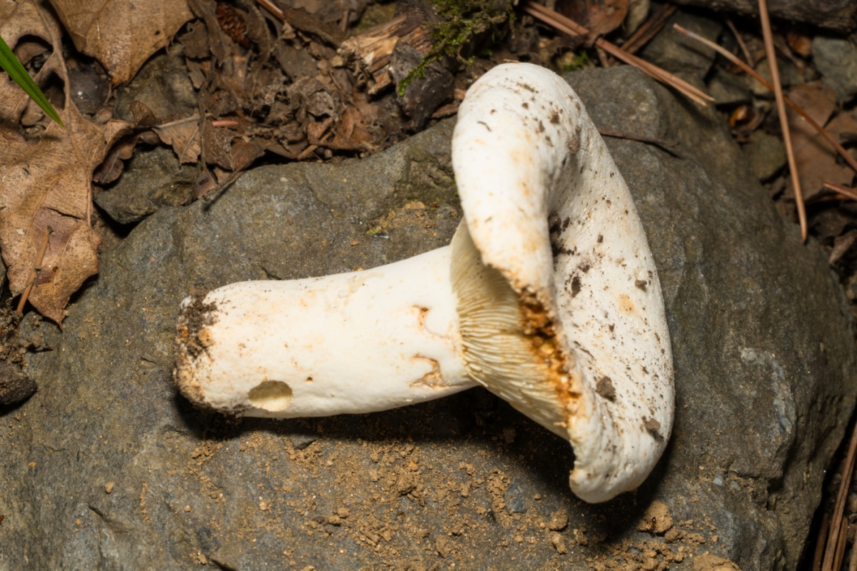 | 특징 | 갓은 흰색∼연한 황색, 탁한 황갈색 얼룩. 주름살은 흰색. 폭이 좁고 빽빽, 젖은 흰색. 대는 흰색, 흔히 밑동이 가늘다. 굴털이가 개칭됨. |