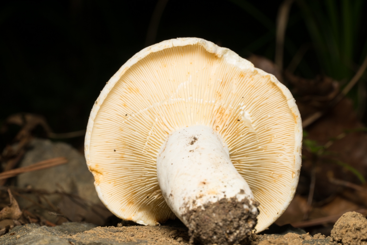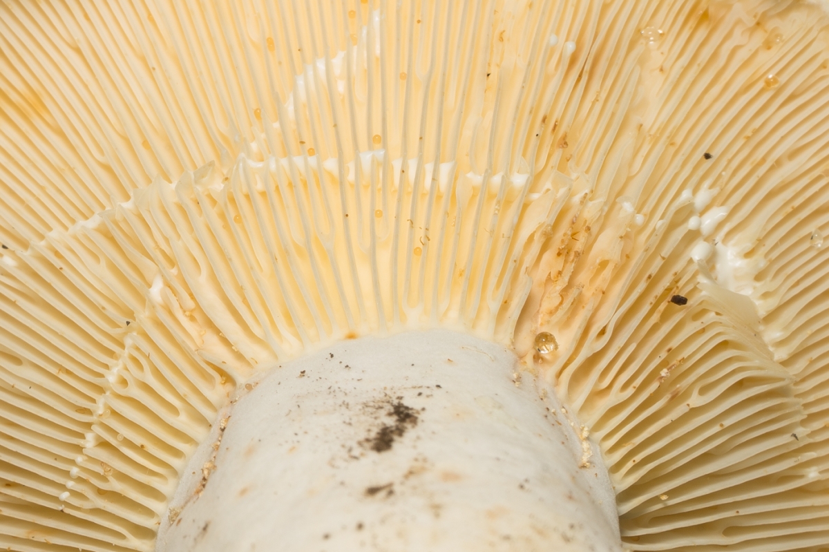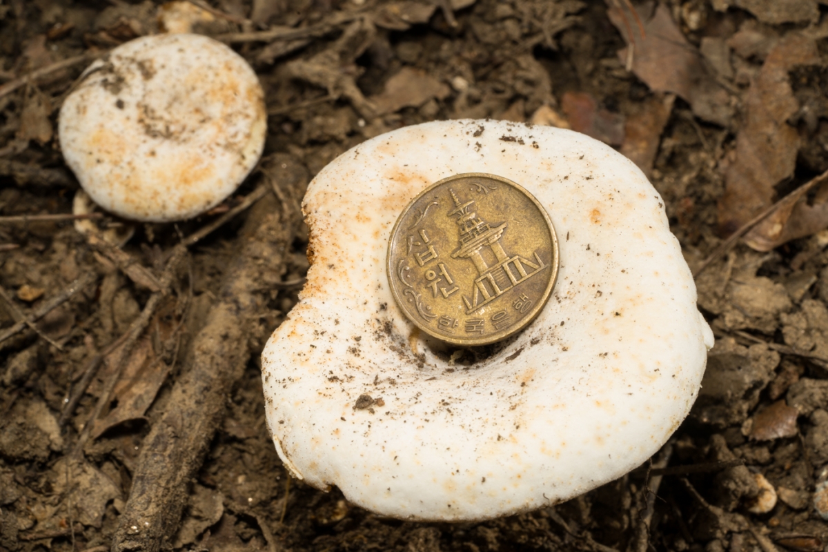 | 자실체 | 갓은 4∼14(18)cm의 소형∼대형. 어릴 때는 낮은 둥근산형, 후에 평평한형이나 중앙이 오목해 진다. 어릴 때는 가장자리가 안쪽으로 감기나 후에 퍼지면 심한 물결모양으로 굴곡을 이루기도 한다. 표면은 점성이 없고 건조. 흰색, 후에 연한 황색을 띤다. 흔히 황색이나 탁한 황갈색 얼룩이 생긴다. 버섯이 땅속에서 퍼지면서 올라오기 때문에 갓 표면에 부식토 등이 피복되는 경우가 있다. 살은 흰색, 치밀하고 두꺼우며 상처를 받으면 황색을 띤다. 유액은 흰색, 변색하지 않는다. 신맛이 매우 강하나 이를 뜨거운 물에 데치거나 썰어서 소금물에 하루 이틀 담궈 유액을 뺀 후, 식용한다. 주름살은 흰색∼크림색, 폭이 좁고 빽빽, 다소 대에 띠붙음이면서 내리붙음. 분지된다. 대는 3∼9cm(굵기10∼30(40)mm), 흔히 밑동은 약간 가늘다. 표면은 흰색이고 단단하다. |