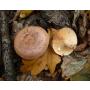 | 자실체 | 갓은 5∼10(15)cm의 중형. 어릴 때는 거의 반구형, 후에 중앙이 오목한 둥근산형∼평평형이 된다. 황색∼오렌지황색, 표면은 어릴 때 섬유상 털이 피복되지만 후에 눌린 모양이거나 비늘 모양 되고 가장자리는 양털모양으로 털이 밀포된다. 습할 때는 점성이 있다. 살은 허연색, 절단하면 보라색을 띤다. 유액은 흰색, 변색하지 않는다. 주름살은 어릴 때는 연한 황색, 후에 크림색, 폭이 좁고 촘촘하며 대에 띠붙음이면서 내리붙음. 상처받으면 보라색이 된다. 대는 5∼8cm(굵기1.2∼3cm), 갓과 같은 색이거나 다소 연하다. 표면에 톱밥 모양으로 거친 것이 불규칙하게 붙는다. 속이 비어있다. |