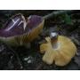 보라색, 포도주적색 또는 포도주흑갈색. 가장자리는 고르고 오래 동안 안쪽으로 감겨 있다. 살은 백색.