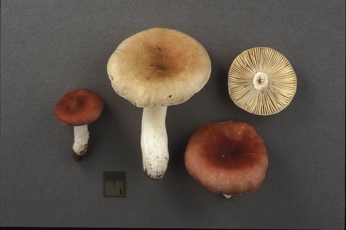 | 자실체 | 갓은 5~9cm로 반구형에서 둥근산모양을 거쳐서 편평하게 되지만 중앙은 무딘 톱니상이고 오래되면 약간 깔때기형이다. 표면은 고르고 약간 결절형이며 포도주적색~칙칙한 핑크적색이나 중앙은 진하다. 가장자리는 고른 상태에서 홈파진 줄무늬선이 있고 표피는 반절까지 벗겨진다. 육질은 백색이고 단단하며 냄새가 약간 나고 맛은 온화하다. 주름살은 넓은 올린주름살로 포크형이고 백색에서 짙은 노란색이다. 날은 고르다. 대는 3~6cm, 굵기는 1~2cm로 원통형에서 막대형이며 속은 차 있고 단단하다가 방처럼 빈다. 표면은 고르고 약간 세로줄의 맥상으로 백색에서 칙칙한 연한 크림색이나 황색으로 된다. |
