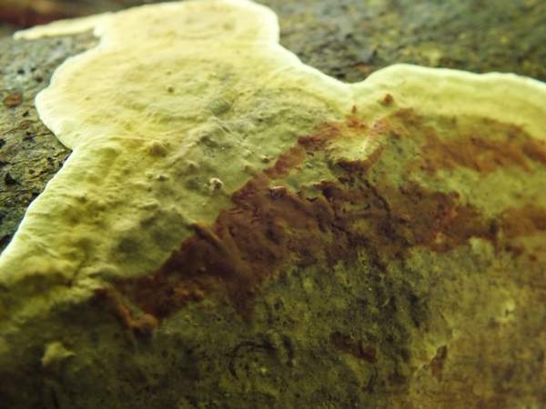 특징 : 반배착생. 자실층에서 반전된 폭 1.5cm 정도 파상의 갓 형성, 녹슨 갈색. 가장자리는 허연색∼황토색. 하면은 평활, 회갈색∼황토갈색. 상처를 주면 적색으로 변한다.