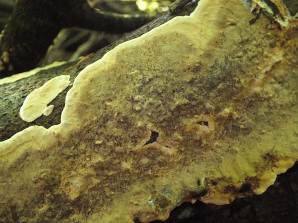 자실체 : 자실체는 배착생으로 얇게 퍼진다. 밀납질이며 오래되면 견질이 된다. 건조하면 단단하다. 처음에는 매우 얇지만 후에는 1mm 정도의 두께까지 두꺼워 진다. 자실층 표면은 연한 황색∼밝은 황색이다가 후에는 갈색을 띤 오렌지색이 된다. 처음에는 평활하지만 후에 점차 결절이 많이 생기고, 깊게 균열이 생기기도 한다. 가장자리는 특별히 다르지 않다.