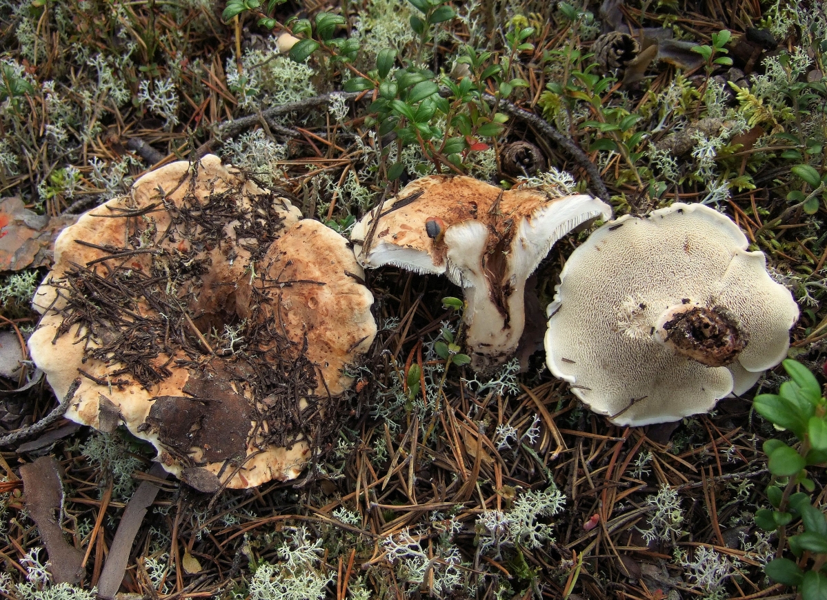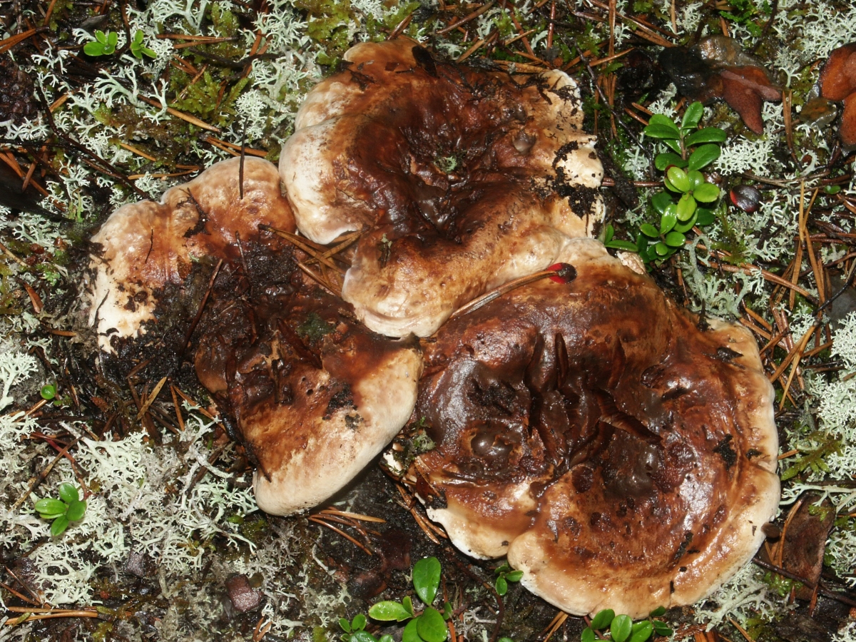 | 자실체 | 자실체는 1년생. 갓은 폭 4∼15cm의 소형∼대형. 처음에는 평평한 형이다가 중앙이 오목 들어간다. 살로 되어 있다. 처음에는 황갈색∼황토갈색, 후에는 다소 적색 끼를 띤 갈색이 된다. 흔히 표면에 각종 솔잎이나 낙엽 찌꺼기 등이 부착된다. 갓의 살은 허연색, 때로는 분홍색 끼가 있다. 일본에서는 맛있는 버섯으로 식용하며, 유럽에서는 식용하지 않는다. 하면 자실층은 침상, 침의 길이는 1∼6mm, 허연색이다가 회갈색 끼를 띤다. 대에 내리붙음이 된다. 대는 길이 1∼5cm(굵기 8∼25mm), 꼭지 부근은 허연색, 아래 쪽은 갈색을 띤다. |