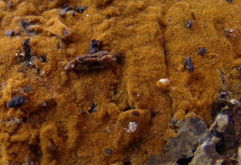 | 자실체 | 자실체는 전체가 배착생. 수 cm의 솜털 모양∼융단 털 모양의 막질을 형성하면서 얇게 퍼진다. 기질에 느슨하게 붙어 있다. 표면은 어릴 때는 회색을 띤 갈색∼약간 자색을 띤 갈색이지만, 후에 녹슨 갈색이 되며 황색 끼를 띠기도 한다. 평활하거나, 분상을 띤다. 하면 기질층은 회색∼암색으로 표면 자실층보다 진하다. 가장자리는 얇게 퍼진다. |