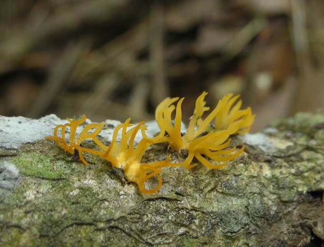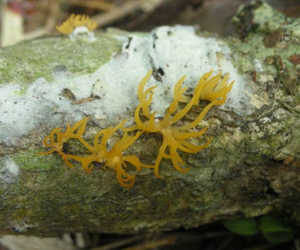 | 자실체 | 자실체 크기는 높이 3∼5(7)mm 정도의 극소형. 활엽수 고목에 산호모양으로 부착한다. 밑동에서 조밀하게 분지되고, 분지된 가지는 아래쪽이 원통형 또는 약간 눌린 모양, 지름 0.5∼1.2mm, 2∼3회 분지된다. 상단 끝 부분은 가늘고 뾰족하다. 털이 없고, 담황색∼황색. 건조하면 적황색∼계피색을 띤다. 살은 황색. |