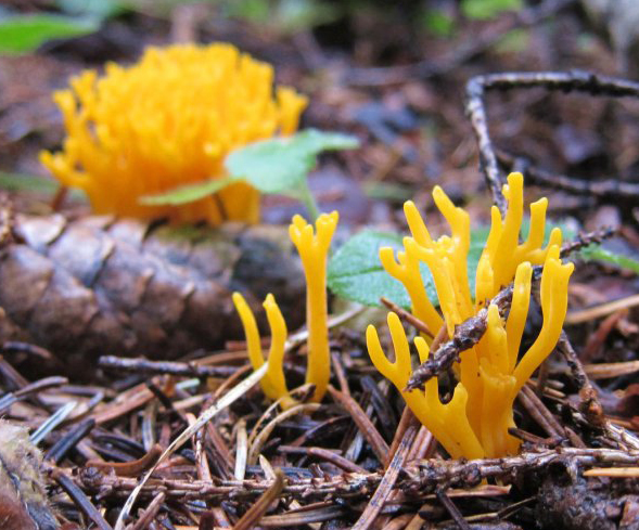 | 자실체 | 자실체는 단생∼속생하며, 일반적으로 밑동에서 가지가 많이 분지되지 않은 싸리버섯 모양이고 젤라틴 질을 가진 연골질이다. 건조하면 각질이 되고 단단해 진다. 전체가 선명한 오렌지황색∼오렌지색 또는 진한 황색을 띠고 높이 3∼5cm 정도이다. 밑동은 원통형이나 압착된 원통형. 가지는 선단을 향해서 2차분지가 계속된다. 살은 흰색. |