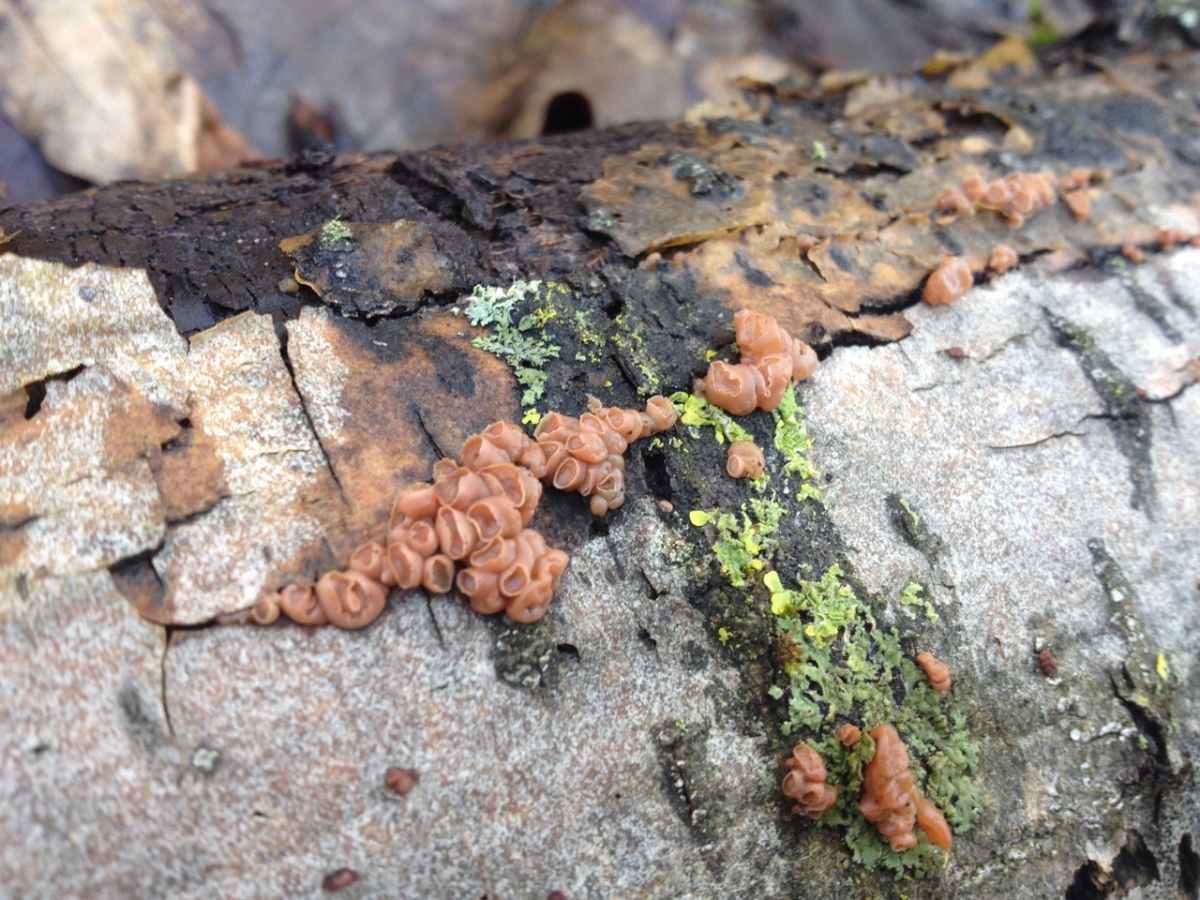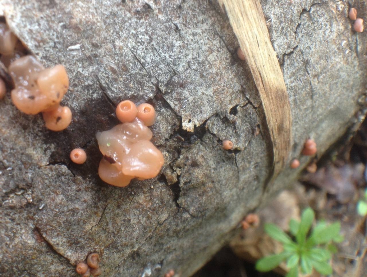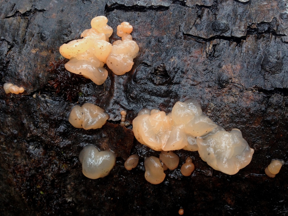 | 자실체 | 자실체는 다양한 형태를 만든다. 평평하게 퍼지기도 하고, 불규칙하게 둥근형, 사람의 뇌모양, 때로는 다소 컵모양 등이 된다. 그러나 짧은 대를 갖고 있으며, 평평하게 퍼지기도 하고, 열편모양 찢어지기도 하고, 기질과 밀착되면서 여러 개가 엉긴 뇌모양이 되기도 한다. 폭 1∼4(5)cm, 위쪽 표면은 평활하고, 젤라틴 질이며, 분홍황토색, 회황토색∼연어살색. |