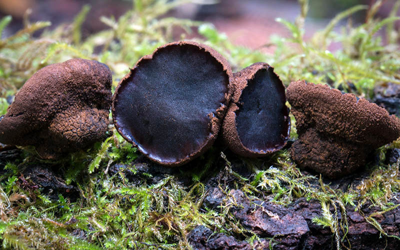 | 자실체 | 자실체는 크기는 1∼3(5)cm, 어릴 때는 구형∼거꾸로 된 난형이며 암갈색. 윗면 중앙부에 둥근 입이 열리면서 점차 확대된다. 성숙하면서 서양팽이모양이 되고 윗면은 얕게 오목해 지면서 흑색의 자실층면이 되고 습하면 광택이 있다. 가장자리는 약간 돌출된다. 후에는 접시 모양이 된다. 바깥 면은 암갈색∼흑갈색. 살은 젤리 질이며 탄력이 있고 연한 갈색. 건조하면 살은 오므라들고 질긴 가죽질이 된다. |