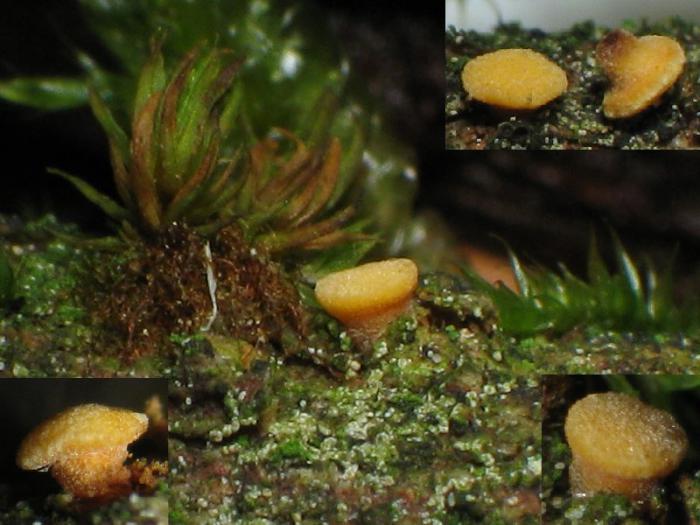 | 자실체 | 자실체는 0.5∼2(3)mm의 극소형. 어릴 때는 표면이 다소 쭈글쭈글한 모양이다가 평평해지며, 방석모양이 된다. 자실체 전체가 오렌지황색이고 표면이 다소 분상이다. 대가 없이 기물에 부착한다. |
