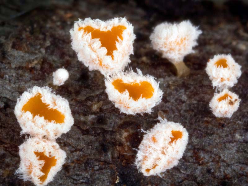 | 자실체 | 자실체는 직경 1∼2mm의 극소형. 컵 모양, 접시 모양이다가 편평해 진다. 대가 없이 기질에 부착한다. 윗면 자실층은 난황색∼오렌지황색이고 평활하다. 가장자리와 바깥 면은 흰색의 털이 두껍게 피복하고 있다. 건조하면 가장자리고 위쪽으로 심하게 말린다. |
