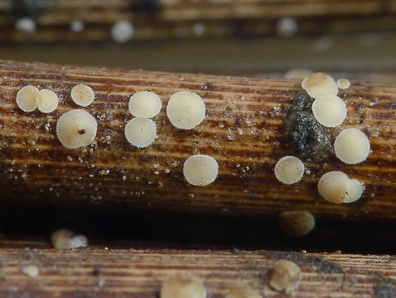 | 자실체 | 자실체는 풀의 줄기에 나는 0.6∼1mm 크기의 극소형. 머리와 대로 구분된다. 머리는 어릴 때 컵 모양이다가 후에 접시 모양 또는 평평형이 된다. 윗면 자실층은 평활, 허연색∼크림색. 바깥 면은 같은 색이고 쌀겨모양의 털이 있다. 가장자리는 백색의 털이 돌출되어 있다. 대는 0.3∼0.5mm이고 원주상이며 흰색 털이 있다. |