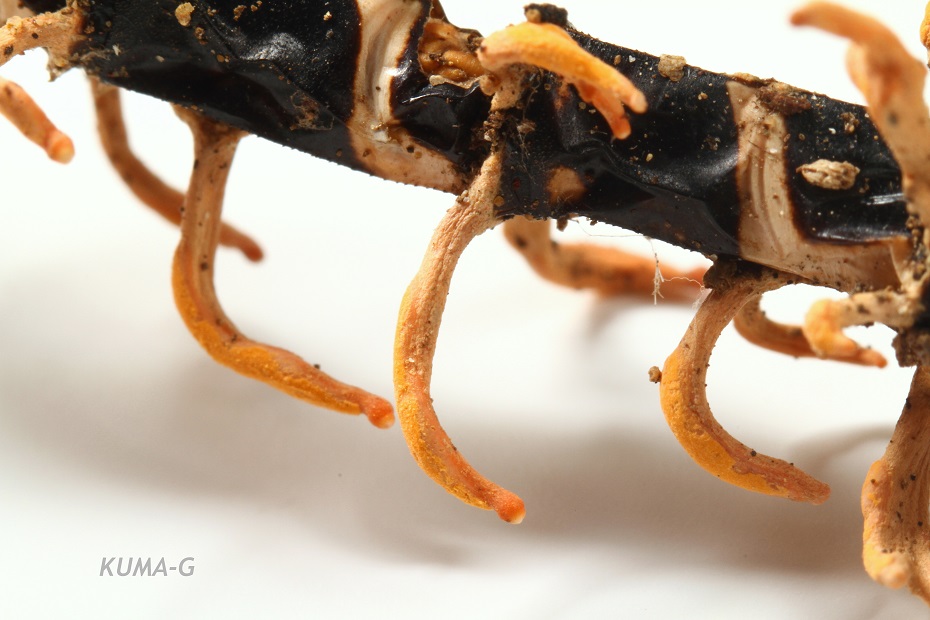 | 자실체 | 자실체(자좌)는 풀이나 나무에 붙어 있는 죽은 각종 잠자리 성충에서 나온다. 자실체는 여러 개가 생긴다. 뿔 모양, 원추형 등이며, 높이 3∼5mm로 매우 작다. 결실부는 위쪽에 생기나 눈으로 구분이 안 된다. 자낭각(자낭과)는 묻힌형. 각공이 미세하게 돌출된다. 담황갈색. 대는 원주형으로 직경 1mm 정도. 머리와 같은 색. 밑동이 기주에 직결된다. |