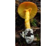 자실체 : 갓은 폭 4∼10(12)cm의 소형∼중형. 어릴 때는 원추형이다가 후에 둥근산형, 평평한 형이 되고 중앙이 오목해 진다. 표면은 오렌지 황색∼오렌지 황토색, 중앙이 다소 진하다. 가장자리에 미세한 홈선이 생긴다. 살은 백색. 표피 아래는 약간 오렌지색을 띤다. 식용한다고 기록되어 있으나, 유사한 독버섯과 혼동되므로 피하는 것이 좋다.