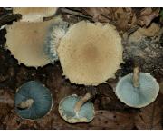 주름살은 청색∼청녹색, 다소 성기고 폭이 넓으며 대에 띠붙음.