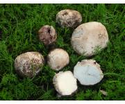 특징 : 중형∼대형. 어릴 때는 거의 구형, 백색. 점차 그을린 회갈색∼자갈색이 되고 표피가 균열되며, 크고 작은 박막이 탈락. 노숙한 포자는 암자갈색. 어릴 때 식용.