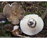 특징 : 소형∼중형. 갓은 어릴 때 자적색, 후에 라일락회색∼쥐회색, 표면은 건조할 때 분상, 습할 때는 다소 미끄럽고 광택이 있다.
