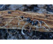 자실체 : 자실체는 불임의 줄기와 임성의 머리로 되고 가는 막대형에서 거의 원통형으로 된다. 자실체의 높이는 7mm, 두께는 0.8mm로 기질 꼭대기의 단단한 부분부터 올라오고 두부(머리)가 1/3~1/2을 차지한다. 표면은 밋밋하고 무디며 백색으로 약간 투명하다.