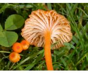 특징 : 1.5cm 이하. 갓은 밝은 오렌지색∼오렌지적색, 대는 연한 오렌지황색.