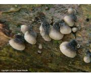 자실체 : 갓은 폭 4(5)∼12mm의 극소형. 버섯의 등면이 기물에 부착되는데(背着), 처음에는 술잔 모양이다가 후에 원형, 난형, 콩팥형, 조개껍질 형 등 다양한 형태로 주름 부분이 노출되어 벌어진다. 전체가 막질이고 융털로 덮이며, 암회색. 가장자리는 안쪽으로 감긴다. 대는 없다. 비식용.