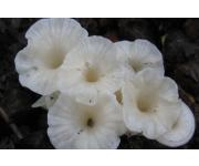 자실체 : 갓은 지름 1.5~4cm정도로 어릴 때는 가운데 골이 얕은 깔때기형에서 점차 깊은 깔때기형으로 되며, 가장자리는 아래로 심하게 말려있다. 갓 표면은 어릴 때는 옅은 백황색에서 크림 백색으로 되고 흡수성을 나타내며, 습할 때는 방사상의 선을 나타낸다. 오래되면 가장자리는 불규칙한 물결모양을 이룬다. 살(조직)은 얇고, 백색이며, 약간 밀가루 냄새가 난다.