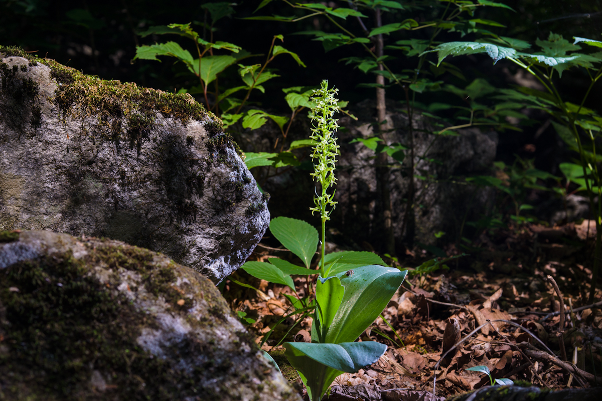 꽃 : 6-8월 개화. 연녹색이고 수상화서는 길이 7-15㎝로서 꽃이 많이 달리며 포는 좁은 피침형이고 끝이 뾰족하며 꽃보다 길거나 비슷하다. 중앙부의 꽃받침잎은 타원형이고 끝이 둥글며 길이 4-5mm로서 1맥이 있고 옆꽃받침잎은 약간 길며 꽃잎과 길이가 비슷하다. 측열편은 작고 예리한 삼각형이며 중앙열편은 선상 긴 타원형으로서 끝이 둥글다. 순판은 길이 5mm정도이고 밑부분에서 3개로 갈라지며 거(距)는 길이 7-9mm로서 원통형이고 앞으로 굽는다.