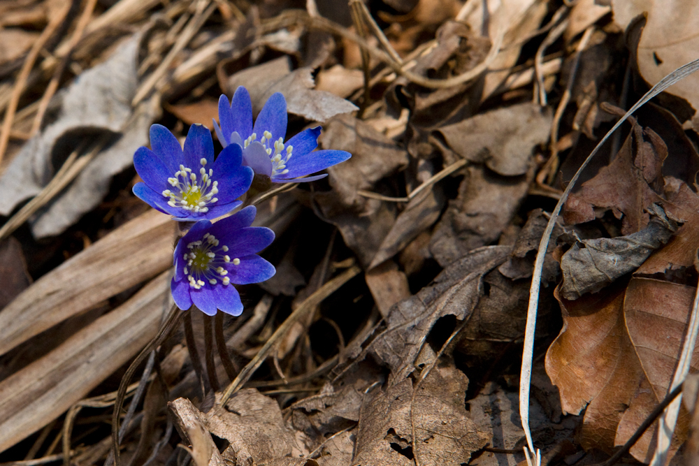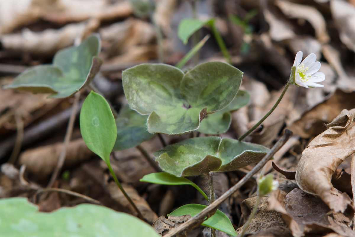 잎 : 잎은 길이 5cm정도로서 모두 뿌리에서 돋고 긴 엽병이 있어 사방으로 퍼지며 심장형이고 가장자리가 3개로 갈라지며 밋밋하다. 중앙열편은 삼각형이며 양쪽 열편과 더불어 끝이 뾰족하고 이른 봄 잎이 나올 때는 말려서 나오며 뒷면에 털이 돋은 모습이 마치 노루귀와 같다.