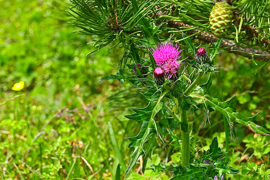 특징 : ▶`가시나물`이라 하여 결각진 잎의 톱니가 모두 가시로 되어 있어서 다치면 따끔거린다. ▶엉겅퀴라 하면 옛날에 스코틀랜드에 침입한 바이킹의 척후병이 성 밑에 난 엉 겅퀴가시에 찔려 비명을 지르는 바람에 성내의 병사들이 깨어나 바이킹을 물리쳤다 하여 구국의 공로로 스코틀랜드의 국화가 된 것으로 유명한 식물이다.