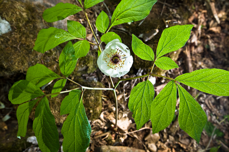 꽃은 6월에 피고 지름 4-5cm로서 백색이며 원줄기 끝에 한 송이씩 달리고 꽃받침잎은 3개이며 난형이고 크기가 서로 다르다. 꽃잎은 5-7개로서 도란형이고 길이 2.5-4cm이다. 수술은 많으며 꽃밥은 길이 5-7mm이고 자방은 3-4개이며 암술대는 뒤로 젖혀진다.
