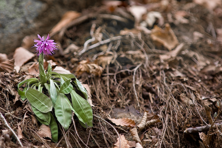 꽃은 4월에 피고 3-10개가 총상으로 달리며 적자색이지만 핀 후에는 자록색이 돌고 화경(花莖)은 높이가 10-30cm로서 포같은 잎이 달리며 새로운 잎이 방석처럼 밑부분의 옆에서 돋는다. 소화경은 열매가 익을 때는 길이 1.5-2㎝이고 화피열편은 6개로 도피침형이며 길이 1-1.5㎝이다. 수술은 6개이고 수술대는 화피보다 길다.