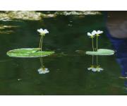 잎 : 1~3개의 잎이 자라 물 위에 수평으로 뜬다. 잎은 원심형으로 직경이 7~20cm 정도로 비교적 작으며 기부 쪽이 깊이 갈라져 있다. 엽병은 길이가 1~2cm로 줄기의 연속으로 연장되어 밑부분이 2개의 귀처럼 확대되어 화서 밑부분을 감싼다.